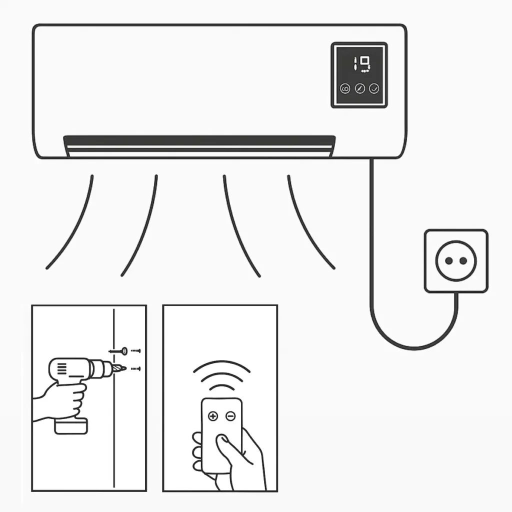 Ne. Naprava ne potrebuje zunanje enote, cevi ali hladilnega plina. Vse deluje znotraj ohišja.